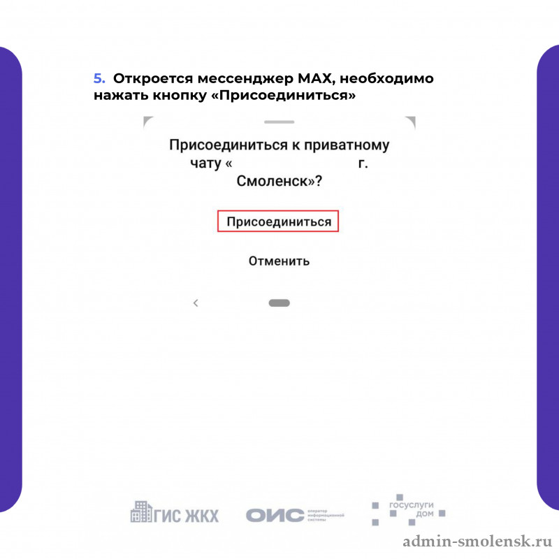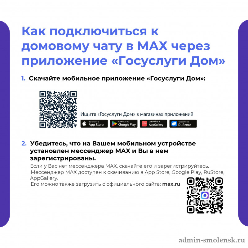 В настоящее время в целях обеспечения коммуникации организаций жилищно-коммунального хозяйства с жителями в национальном мессенджере МАХ оператором созданы домовые чаты, владельцем которых является Главное управление «Государственная жилищная инспекция Смоленской области». Присоединиться к домовому чату в МАХ можно непосредственно из мобильного приложения «Госуслуги.Дом».