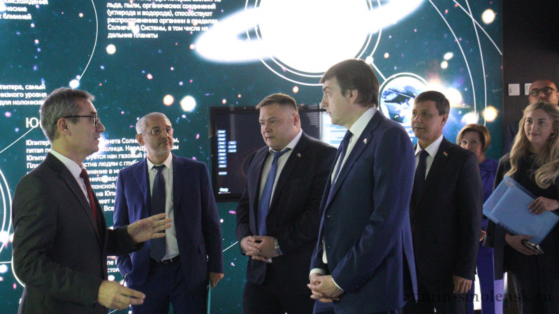 В школе имени Ю.А. Гагарина Министр просвещения осмотрел центр профессионального мастерства педагогов «Институт «Россия», библиотечно-информационный центр, залы именных аудиторий выдающихся педагогов, а также аудиторий, посвященных космонавтам – членам первого отряда космонавтов. Он также посетил школьный музей-планетарий и школьный «Кванториум».