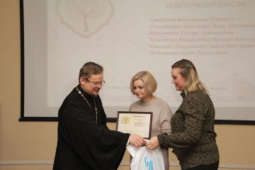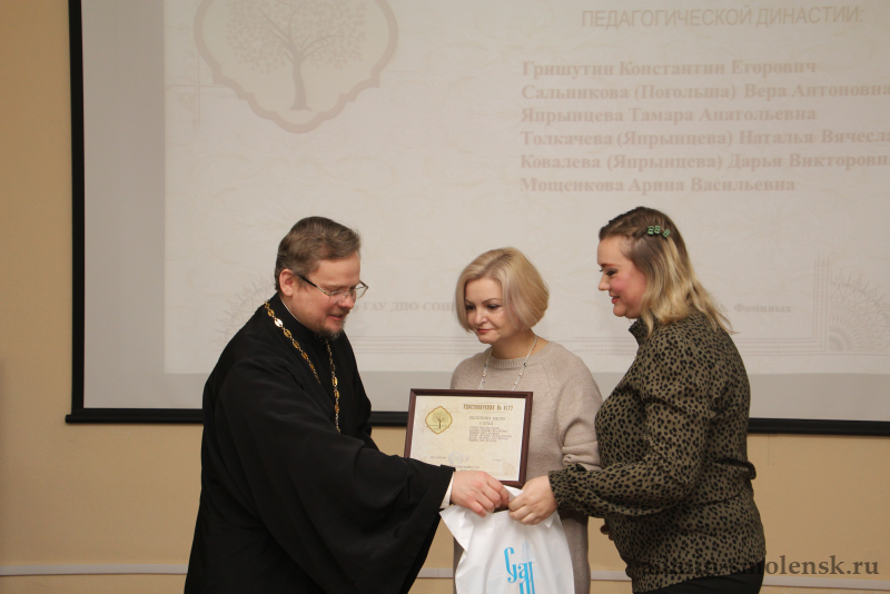 Почетная миссия вручения Памятных Удостоверений выявленным семи новым династиям как хранителям духовно-нравственных семейных ценностей была выполнена Сергеем Захаровым, проректором института, и иереем Александром Коржаковым. Теперь в Смоленской области насчитывается 178 педагогических династий и 5 династий священнослужителей.