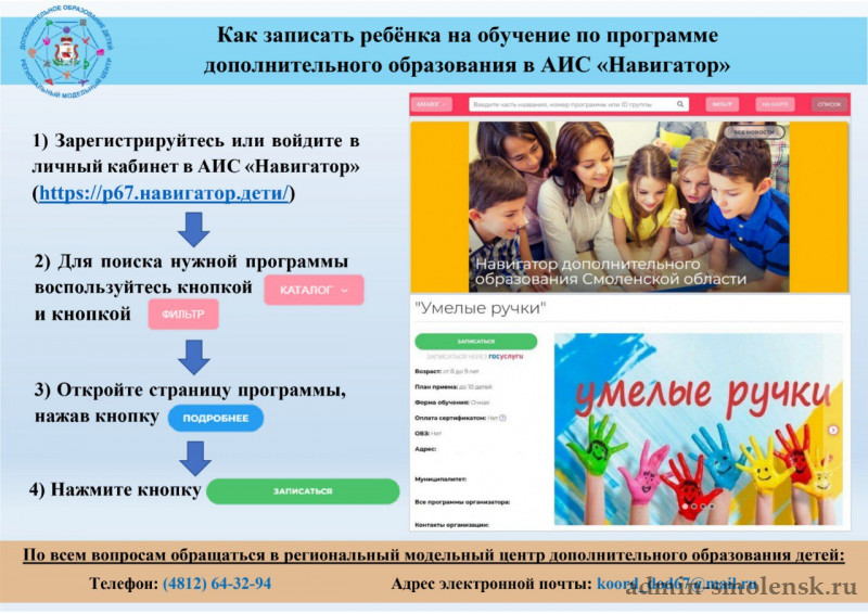 С помощью единого информационного портала ребенок сможет найти занятие себе по душе. Ознакомиться со списком кружков и секций, а также подать заявку можно по ссылке: https://р67.навигатор.дети/.